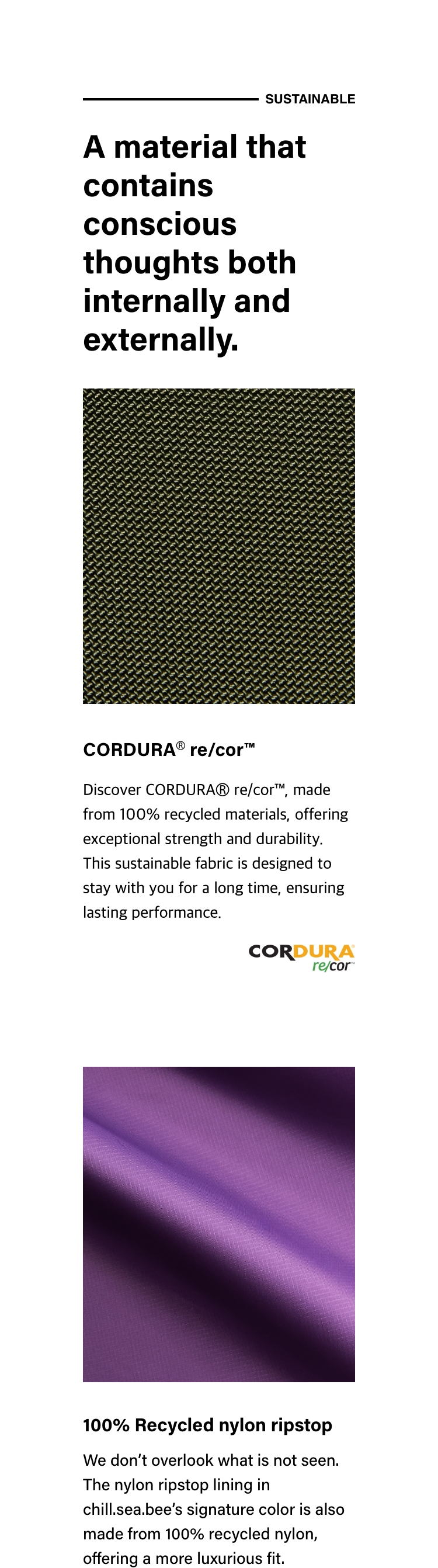Shell: 100% Recycled fabric CODURAⓇ re/cor™